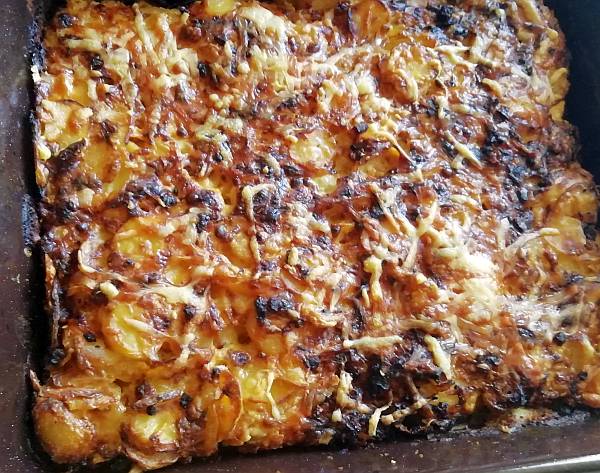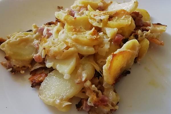 In der Zwischenzeit den Käse reiben und miteinander vermischen. Die Kartoffeln mit der Speck-Zwiebelmasse und der Hälfte des geriebenen Käse mischen und in eine Auflaufform geben.