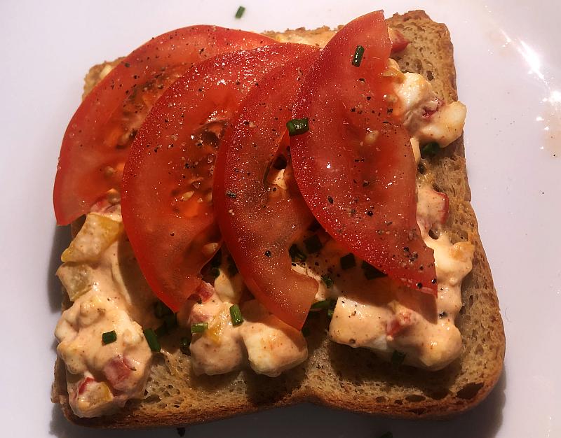 Die Toastbrotscheiben alle vortoasten. Dann mit der Masse bestreichen und im Backofen bei Oberhitze rund 5-7 min. backen. Die Tomaten in Scheiben, den Lauch in feine Röllchen schneiden und den fertigen Toast damit garnieren.