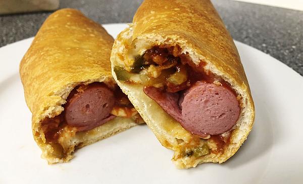 Den Teig ausrollen und in 4 Streifen schneiden. Jeweils in der Mitte mit etwas Ketchup bestreichen. Dann auf jedes Teigstück erst eine Wurst legen,