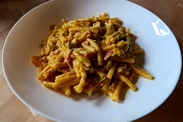 Nudeln mit dem Lauch, dem Schinken, dem Kräuterfrischkäse, und den Gewürzen in einen Topf geben, die Brühe darüber gießen und aufkochen.