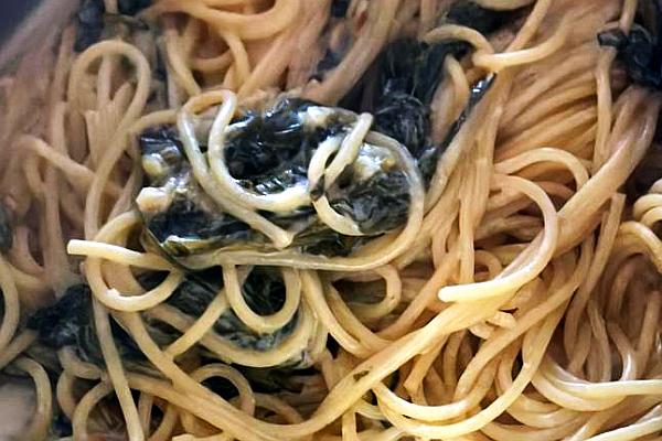 Die Nudeln 'al dente' kochen. 200 ml Kochwasser aufheben.