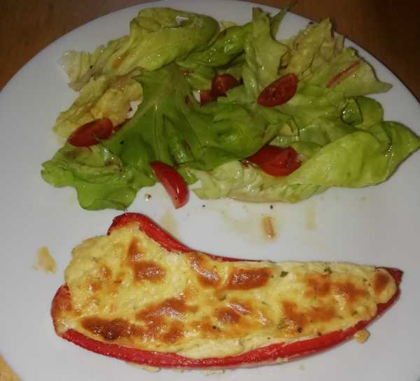 Die Paprikaschoten längs halbieren, putzen, Kerne entfernen und dann waschen. Mit der Öffnung nach oben in eine Auslaufform legen. Den Feta mit der Sahne, der Petersilie und den Eigelb im Mixer cremig verrühren. Mit Salz und Pfeffer abschmecken und dann in die Paprikaschoten füllen. Mit Paprikapulver bestäuben und im Backofen für rund 20 Min bei 180°C. garen. Auf einem flachen Teller zu einem grünem Salat mit Kirschtomaten servieren.