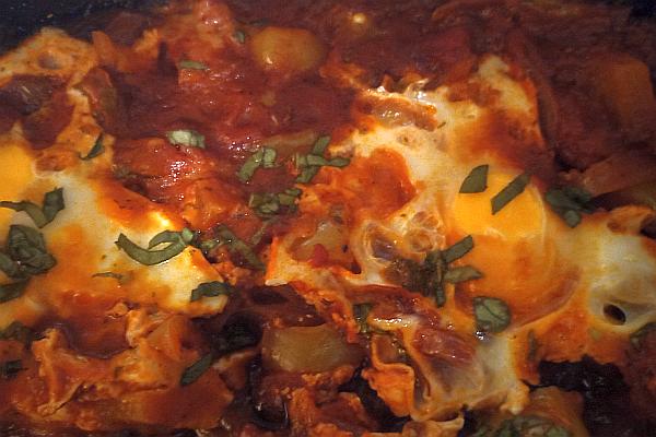 Dann den frisch geriebenen Parmesan unterrühren. Insgesamt 4 Mulden in das Gemüse drücken. Dort jeweils ein Ei hinein laufen lassen, dabei aufpassen, dass der Eidotter ganz bleibt. Nun bei kleiner Hitze die Eier in dem Gemüse ca 10 min. pochieren lassen.