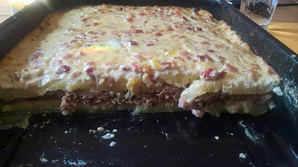 Die erste Portion Kartoffelteig auf einem großen Schneidebrett ausgerollen (geht noch besser mit Dauerbackfolie) und dann in die leicht gefettete Auflaufform geben. Die Leberwurst mit dem Hackfleisch und dem Ei und den Gewürzen gut miteinander mischen und dann auf dem Kloßteig verteilen. Darauf dann die 2 Portion Kloßteig legen, die auch vorher auf dem Schneidebrett ausgerollt wurde. Geht am einfachsten in kleinen Stücken. Dann im Abstand von 3-4 cm mit dem Stiel eines Kochlöffels Löcher in die Masse machen.