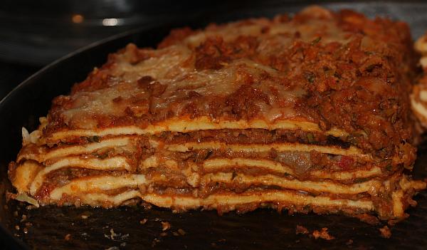 In eine runde Auflaufforn (oder auch Kuchenspringform) als erstes einen Pfannkuchen legen, dort dann etwas Hackfleischsauce verteilen und etwas Käse darüber streuen. Das ganze nun noch 5 mal wiederholen. Als Abschluss wieder Hackfleisch und den restliche Käse darüber geben.