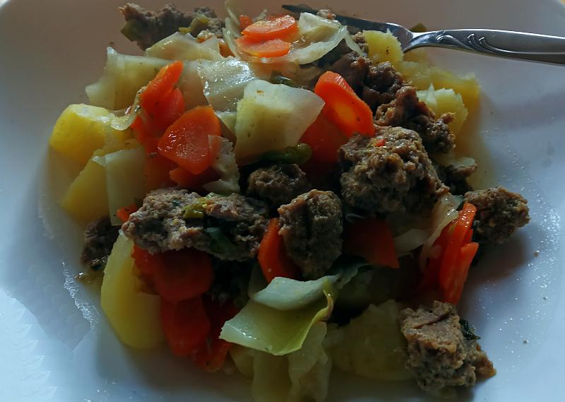 Nun 1/3 des Kohls in einen Topf geben, 1/3 der Möhren und 1/3 der Lauchzwiebeln drauf und die Hälfte des Hackfleisch in kleinen Stücken verteilen. Das ganze nun wiederholen und mit Kohl und Möhren abschließen. Nun das Brühepulver und das Wasser drüber geben. Die Salzkartoffeln und den Eintopf gleichzeigt auf höchster Stufe zum kochen bringen. Wenn beides kocht, bei dem Eintopf die Hitze auf 50%, bei den Kartoffeln auf 10% reduzieren. So wird beides gleichzeitig gar.