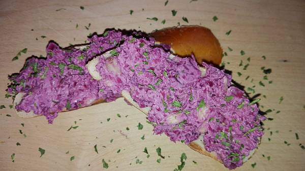 Alternativ kann man auch ein kleines Glas Rotkohl kaufen und abtropfen lassen. Die Brühe auffangen.
